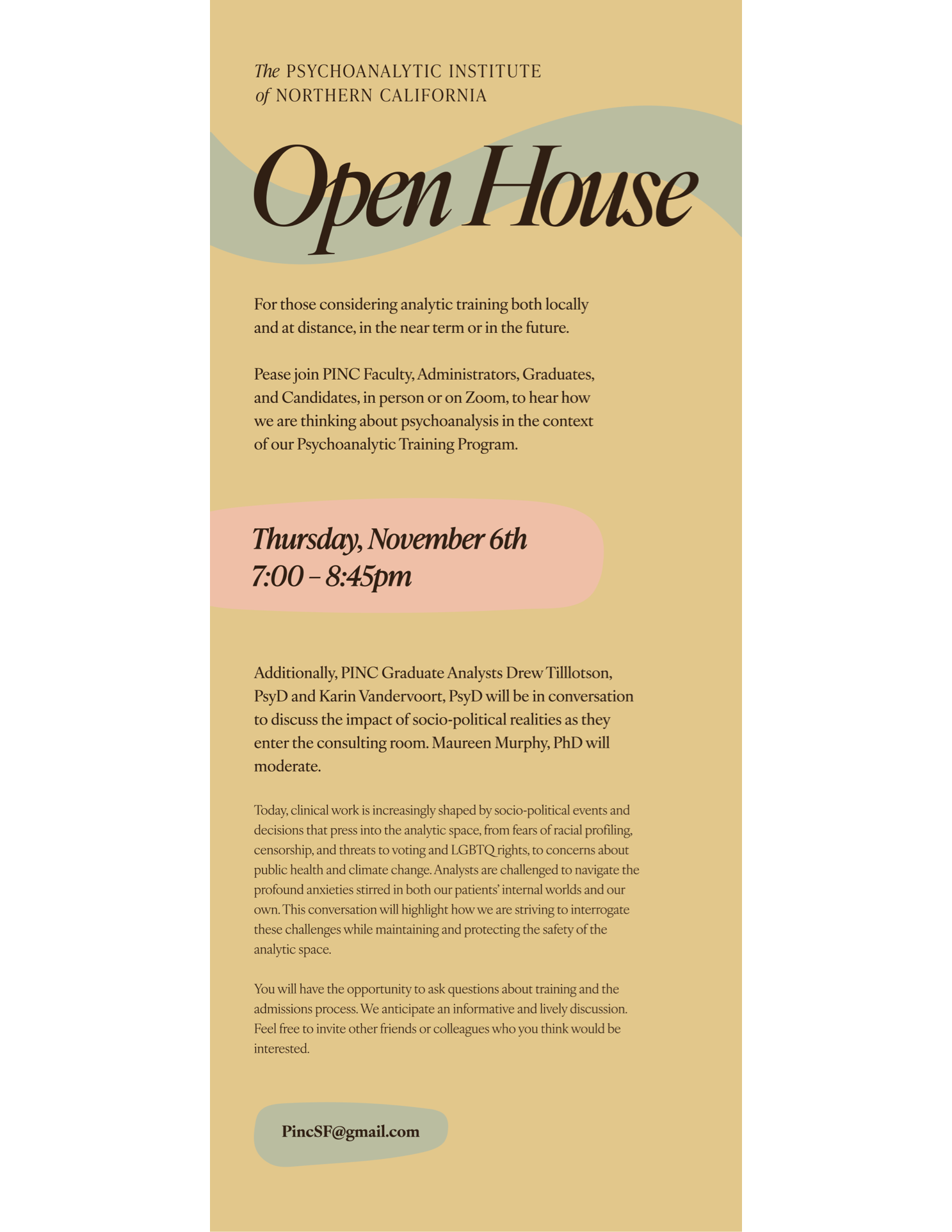 Today, clinical work is increasingly shaped by socio-political events and decisions that press into the analytic space, from fears of racial profiling, censorship, and threats to voting and LGBTQ rights, to concerns about public health and climate change. Analysts are challenged to navigate the profound anxieties stirred in both our patients’ internal worlds and our own. This conversation will highlight how we are striving to interrogate these challenges while maintaining and protecting the safety of the analytic space. You will also have the opportunity to ask questions about training and the admissions process. We anticipate an informative and lively discussion. Feel free to invite other friends or colleagues who you think would be interested.