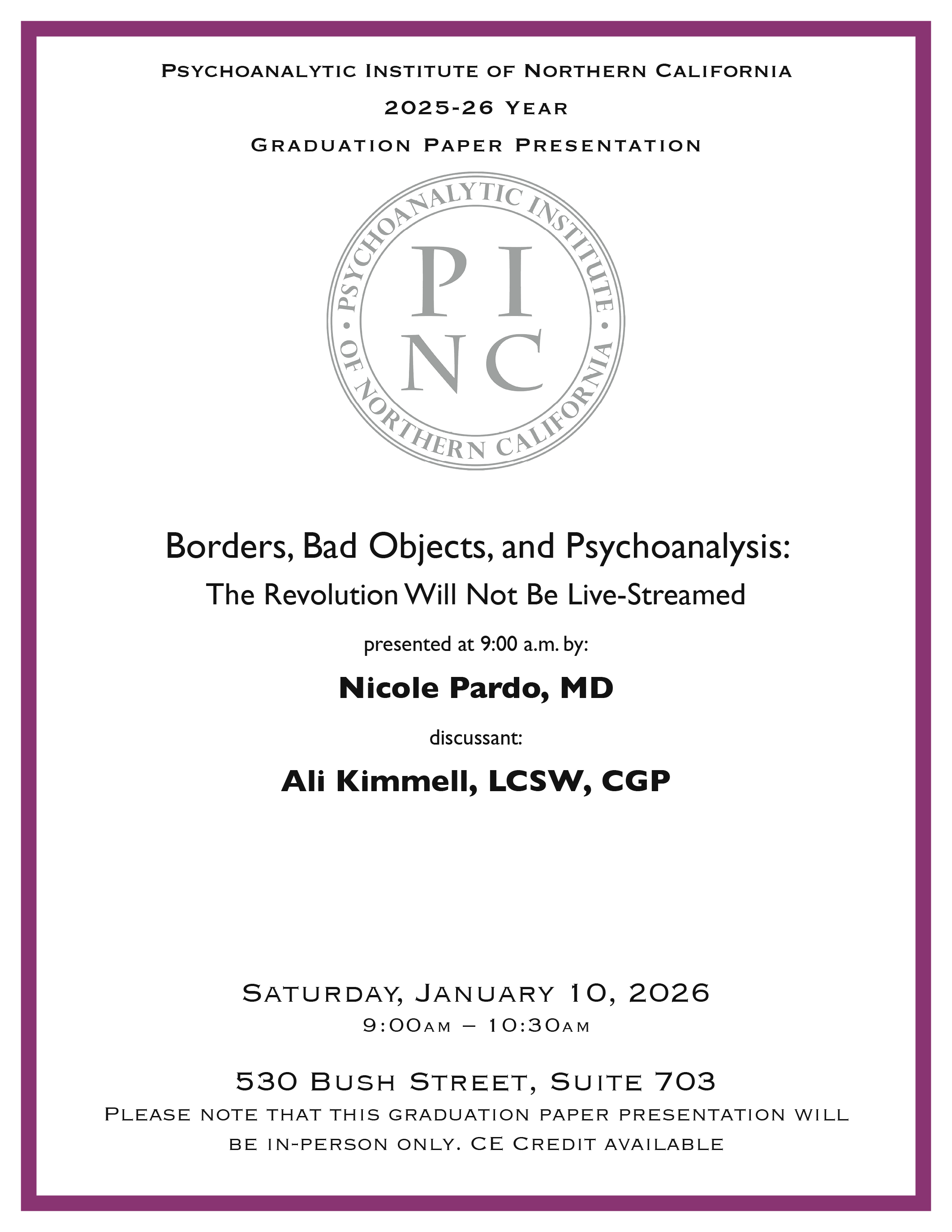 The Psychoanalytic Institute of Northern California (PINC) is approved by the American Psychological Association to sponsor continuing education for psychologists. PINC maintains responsibility for this program and its content. Visit db.pincsf.org/policies for policies and disclaimers.
