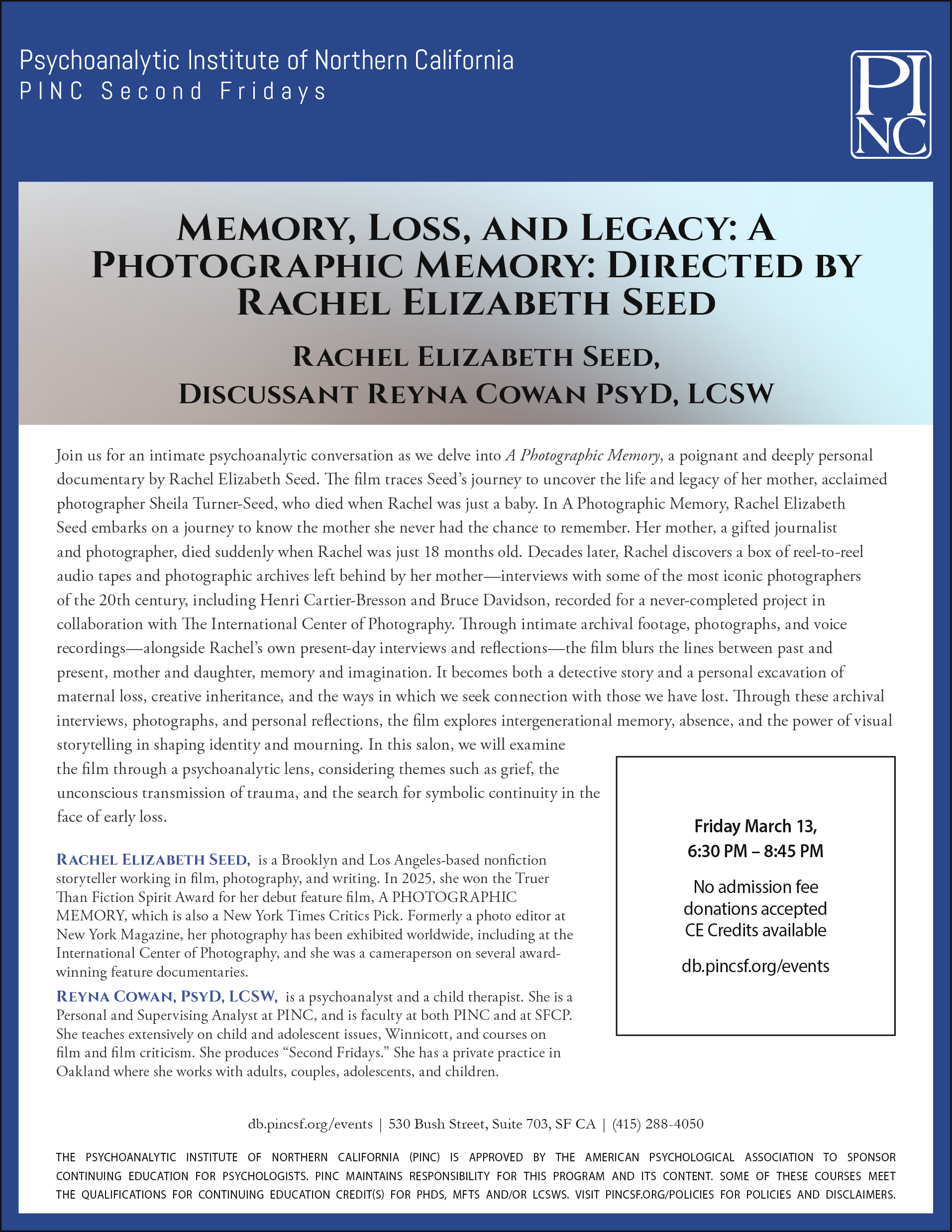 The Psychoanalytic Institute of Northern California (PINC) is approved by the American Psychological Association to sponsor continuing education for psychologists. PINC maintains responsibility for this program and its content. Visit db.pincsf.org/policies for policies and disclaimers.
